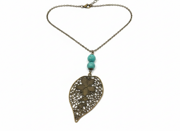 Početna Web shop Nakit Ogrlice LIST + TIRKIZ: veliki privjesak na dugačkom lančiću